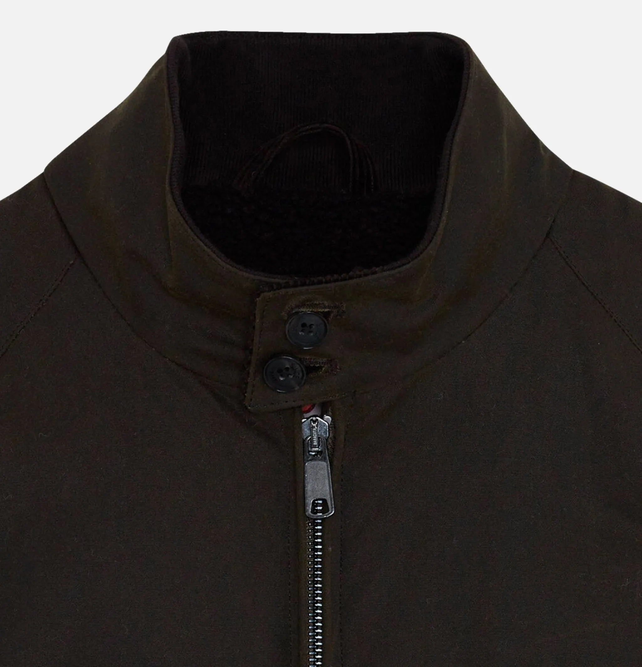 - Two deep front pockets with flap and custom Baracuta button closure