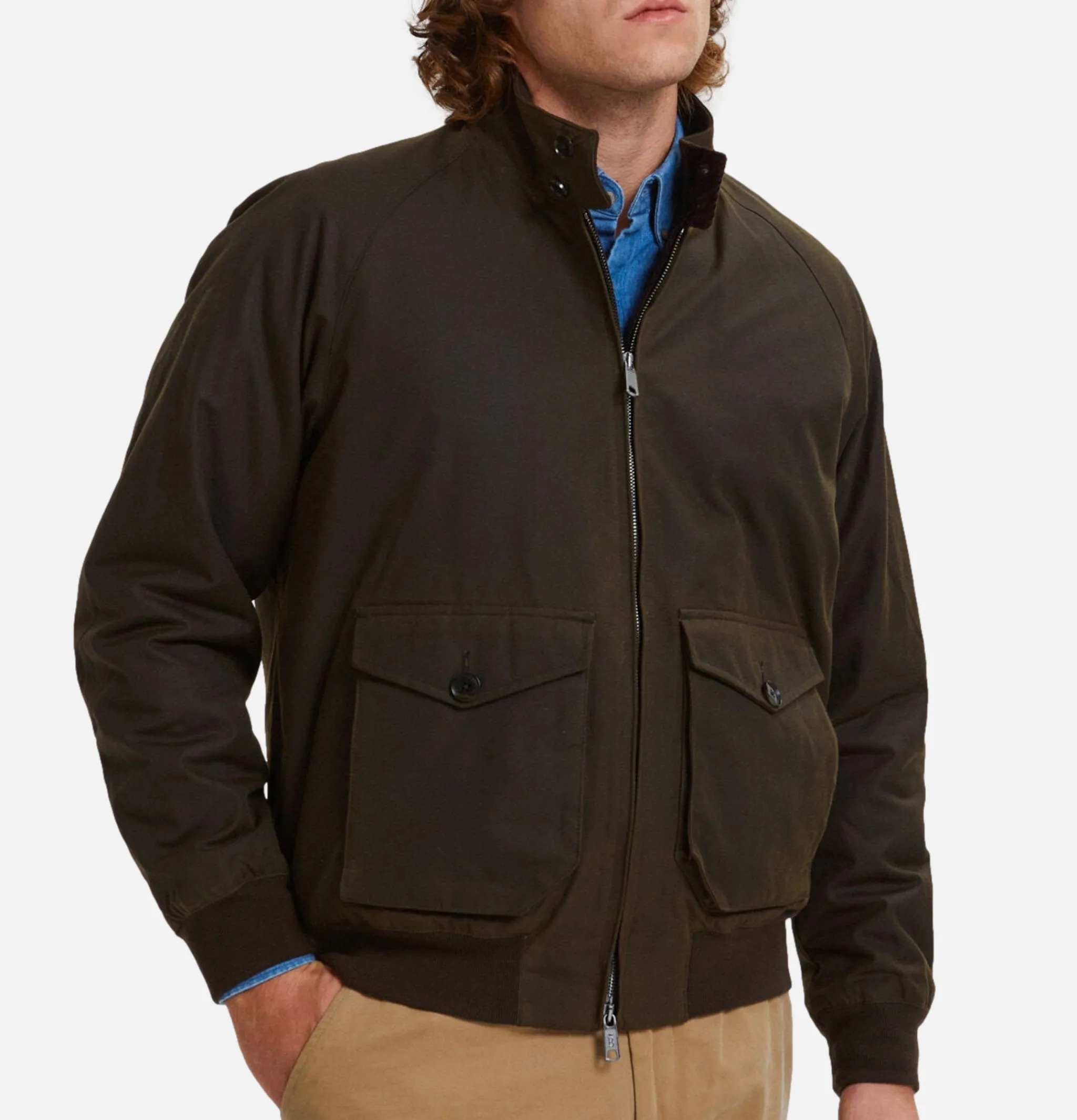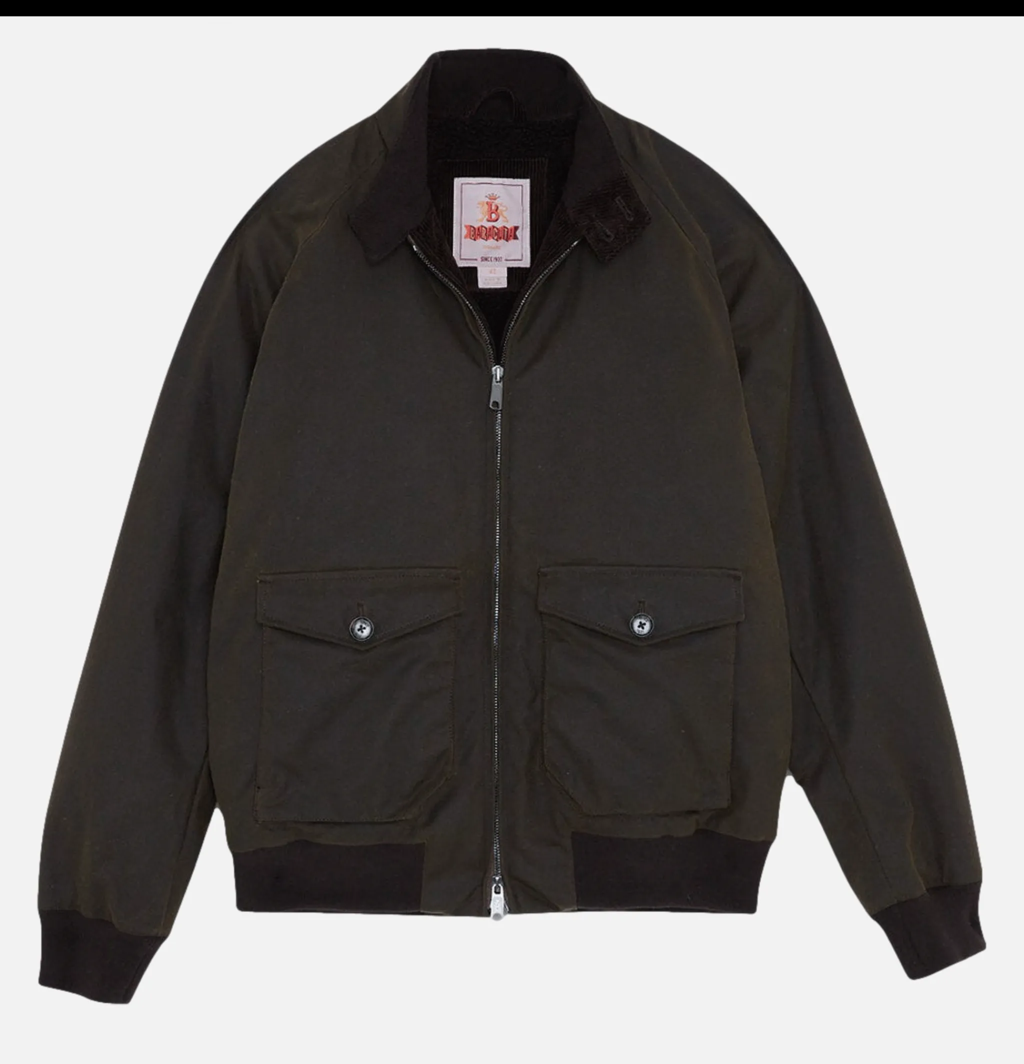 - Two deep front pockets with flap and custom Baracuta button closure